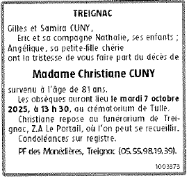 Décédée à Tulle (19000, France) le mercredi 1 octobre 2025 à l'âge de 81 ans