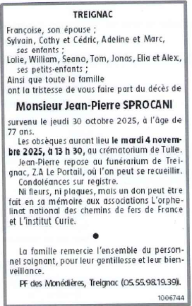 Décédé à Treignac (19260, France) le jeudi 30 octobre 2025 à l'âge de 77 ans